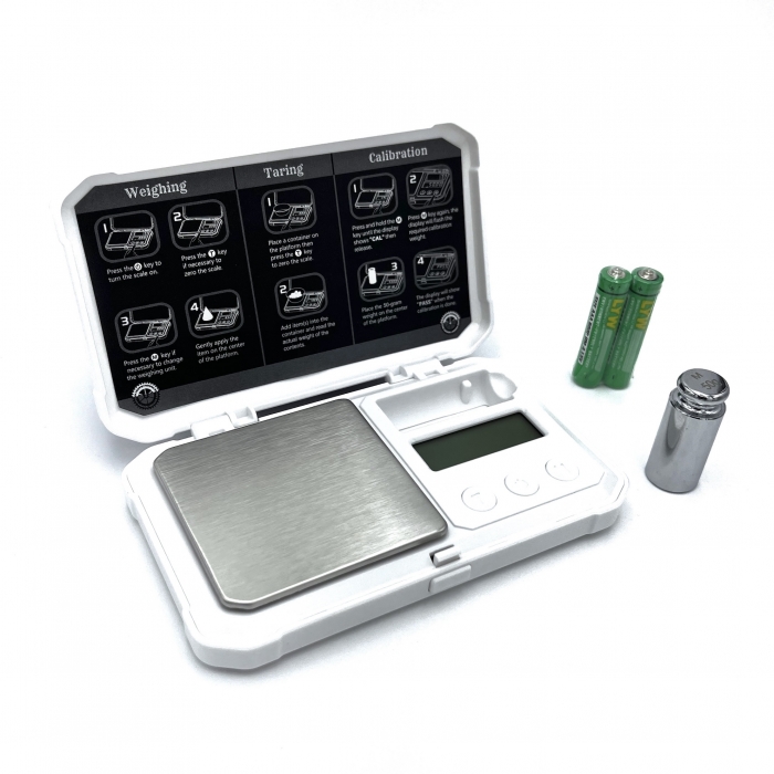 • Complete Ready-to-Use Kit: Comes with everything you need: the scale, a 50g calibration weight, and a detailed visual instruction sheet printed inside the lid for quick setup and calibration.