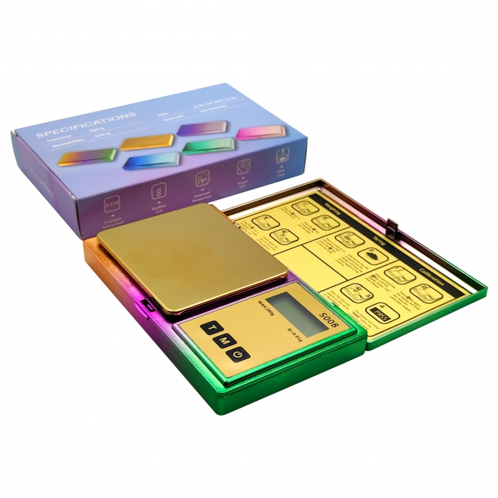 This Rainbow Digital Pocket Scale combines style with accuracy. With a 200g capacity and 0.01g precision, it’s ideal for weighing jewelry, herbs, coins, spices, and more. The unique rainbow metallic finish with a gold plate adds a premium touch.